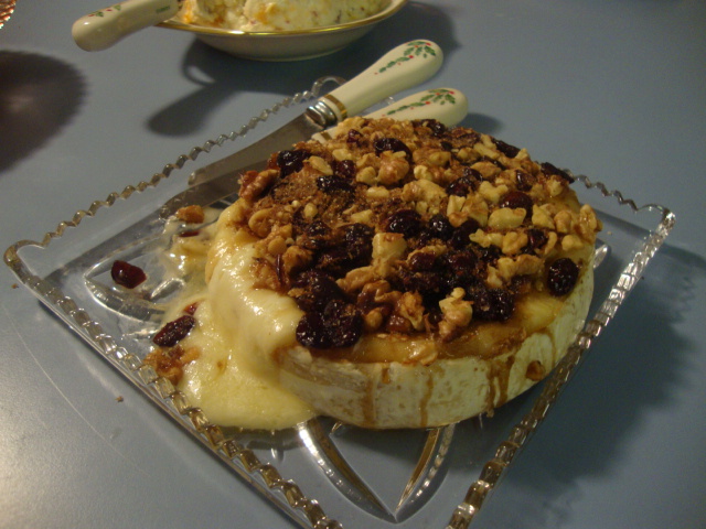 Baked brie topped with cranberries and walnuts.