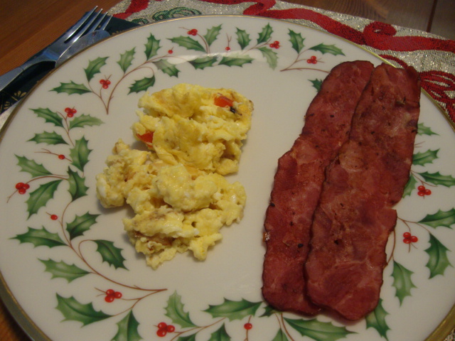 a small plate of eggs with red and green pepper and Applegate Farms turkey bacon,