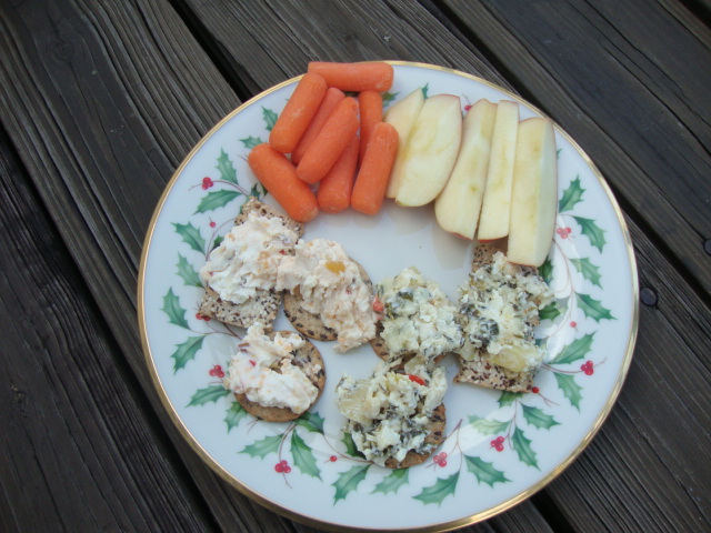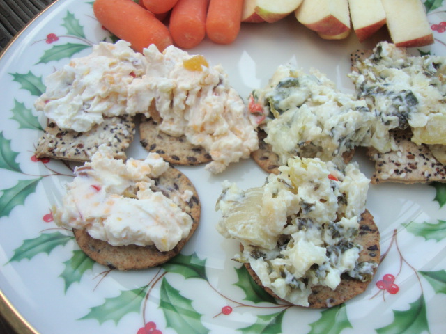 and crackers with leftover hot pepper peach and spinach dip.