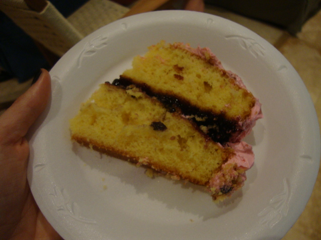 and a slice of delicious yellow cake with blueberry jam and vanilla buttercream.
