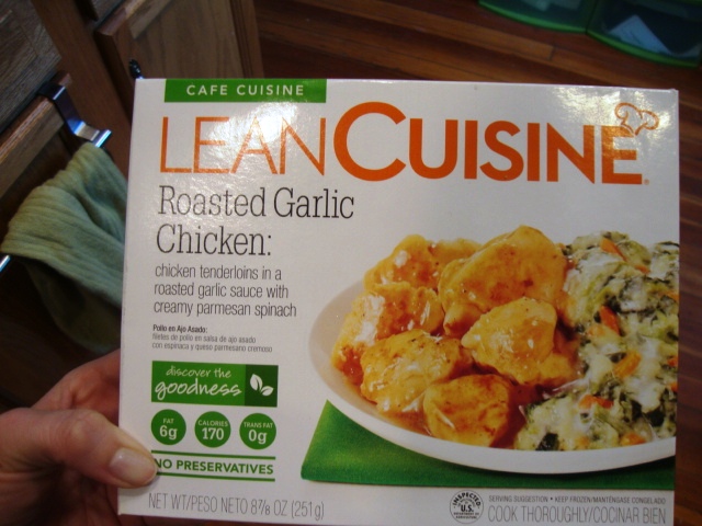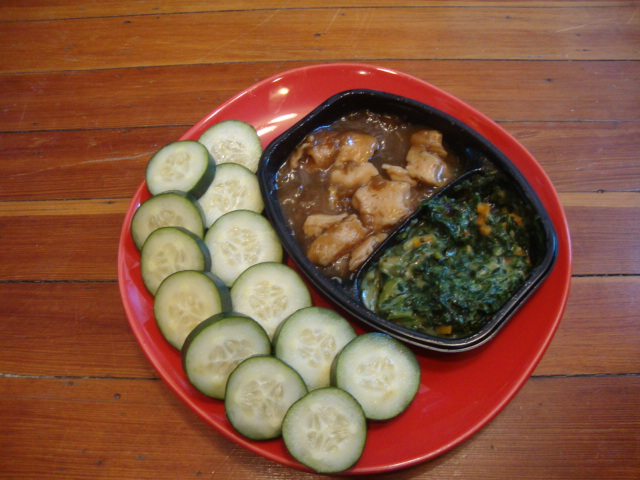 Lean Cuisine Roasted Garlic Chicken, with sliced cucumber on the side.