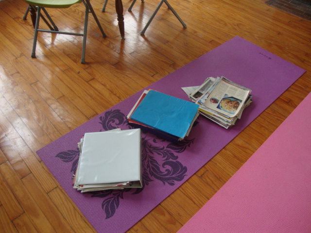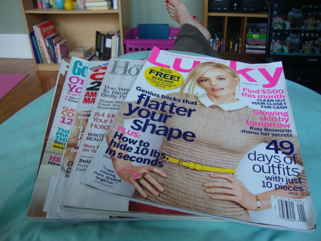 Stack of magazines, cookbook reading, crafting, home cooked dinner, baking.