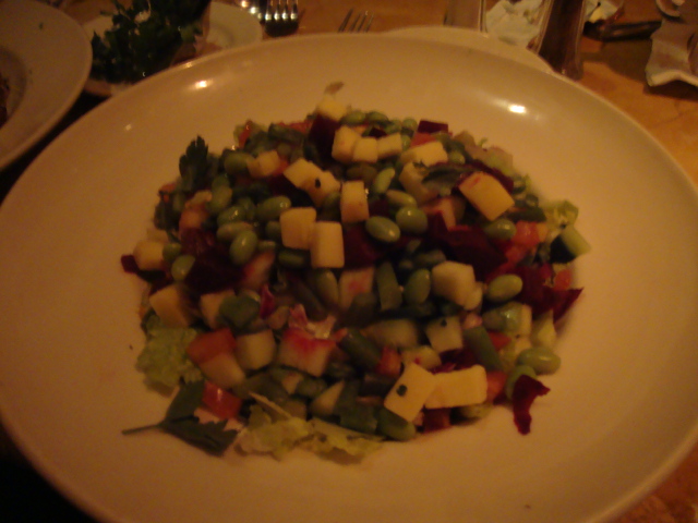 The fresh vegetable salad – asparagus, green beans, tomato, cucumber, roasted beets, apple, edamame, radicchio, romaine, and white cheddar – with a side of spicy peanut vinaigrette.