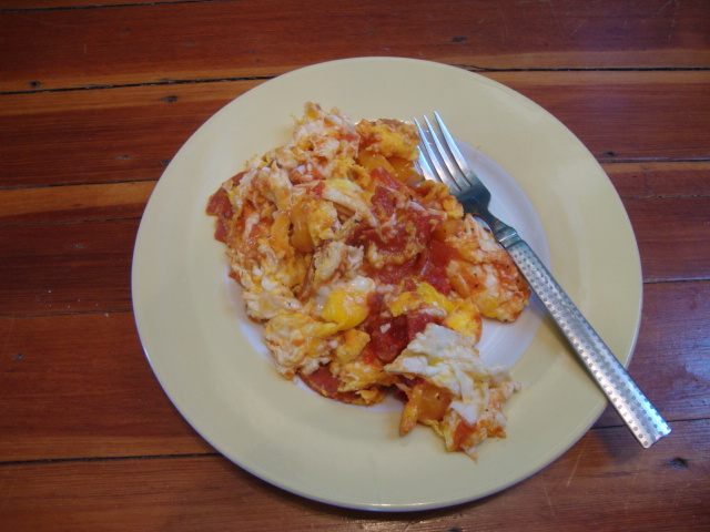 Eggland’s Best scrambled up with turkey pepperoni, sharp cheddar, and marinara sauce.  To die for.