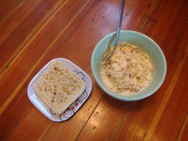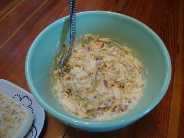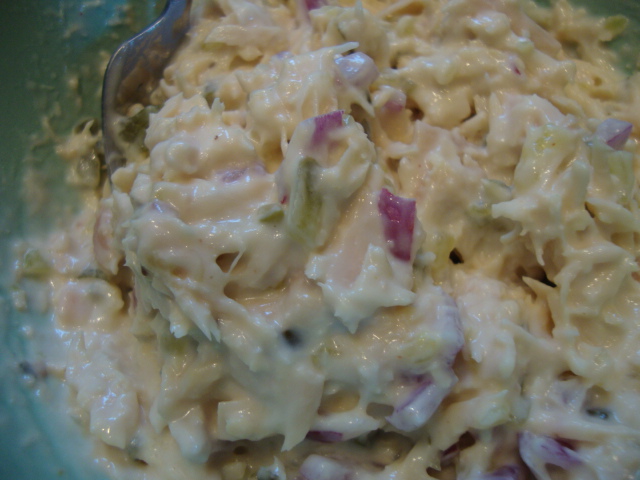 I call this “Last Date Tuna Salad;” my regular recipe – canned tuna, miracle whip, and tons of pickle relish – taken over the edge with the addition of lots and lots of chopped red onion.  Try it, you’ll thank me, just don’t kiss anyone right after lunch!
