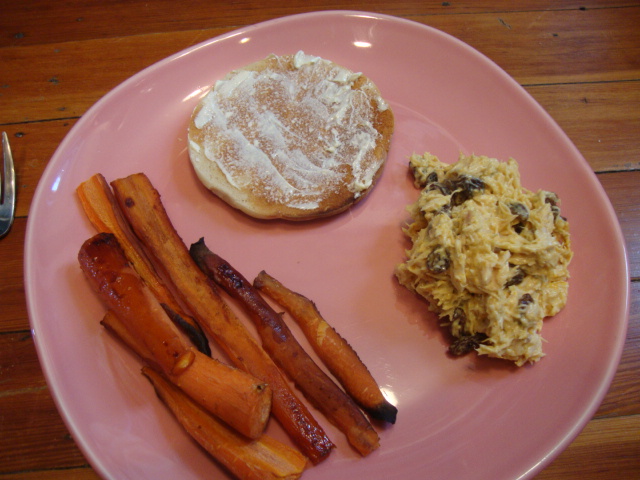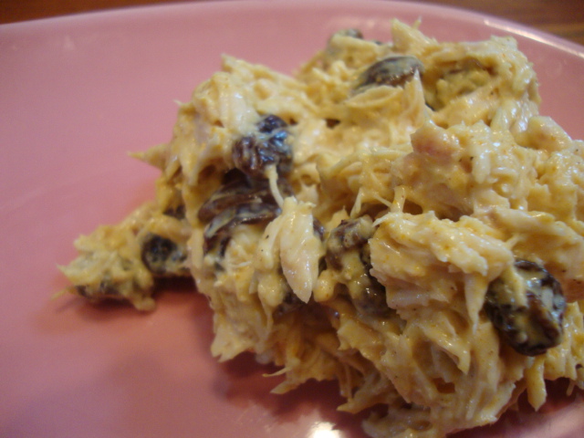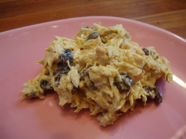 I mixed up half a can of tuna, some Miracle Whip, 3 Tbsp of raisins, and a healthy shake of sweet curry powder.