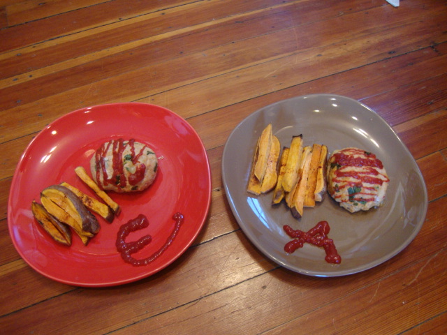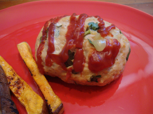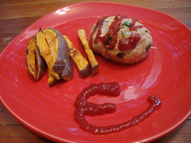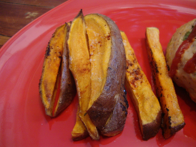 Leftover mini cheesy meatloafs with roasted sweet potato fries.