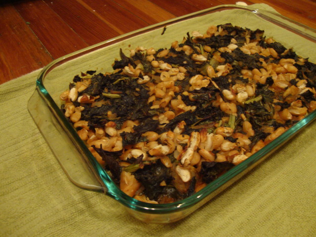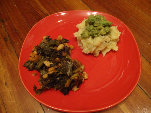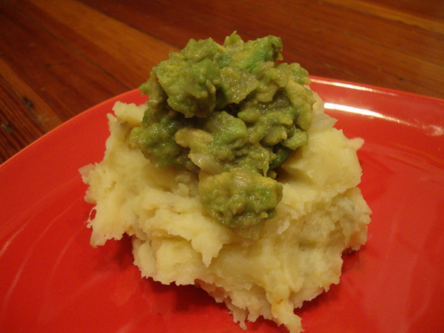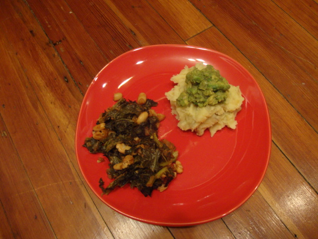 A time intensive(ish) one as well, the potatoes required a good hour of hands-on time while the beans were baking in the oven.  As I was removing the caramelized onions from the pan genius struck, and guacamole gravy was born.  I kept a few onions in the pan over medium heat and added a chopped avocado and a bit of evoo.  Once everything was warmed through I deglazed the pan with some mushroom broth.  A bit more broth and some mashing, and the best potato topped ever was born!