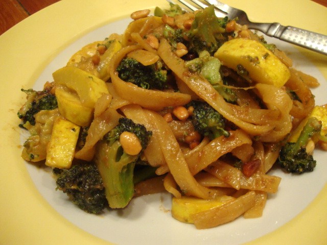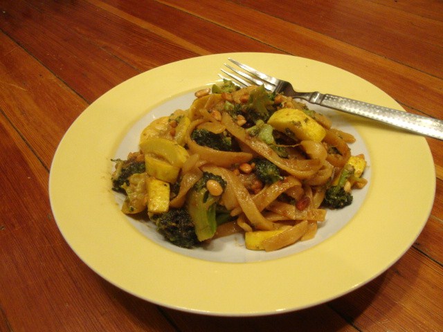 I whipped up two servings of my Easy Peasy Peanut Noodles for Adam and I. We used linguine with broccoli and yellow squash. I went ahead and steamed a bunch of veggies to have on hand the rest of the week.