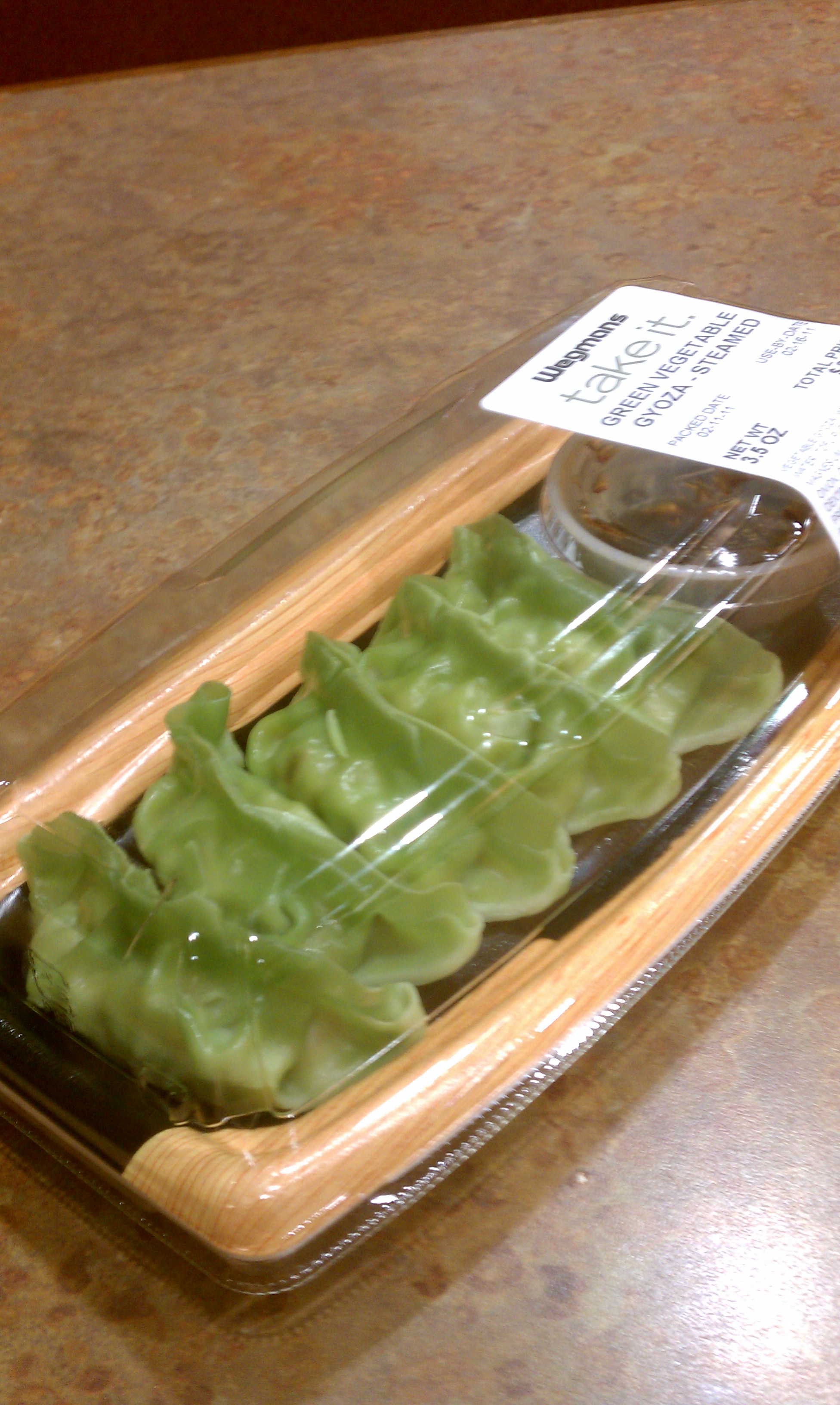 So far the vegan challenge has been easy breezy, but tonight, surrounded by the chicken wings and pizza logs of Wegman’s hot bar, it felt pretty challenging.  All I can say is thank God was able to find these (vegan) veggie wontons at the sushi counter.