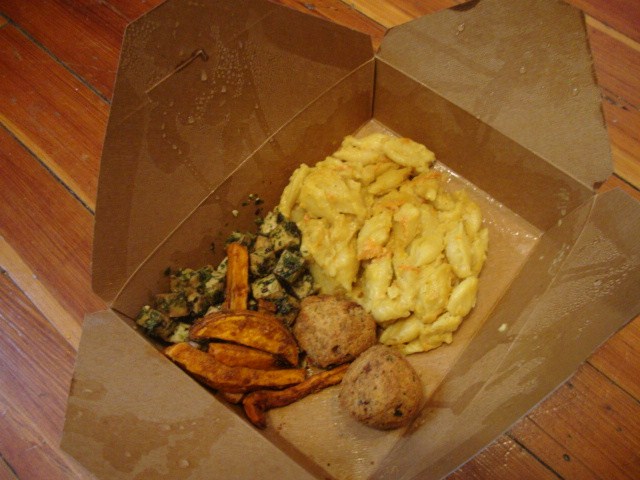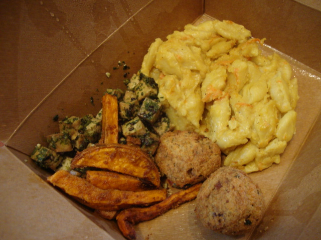 I got vegan mac and cheese, cilantro baked tofu, falafel, and a few pieces of Cajun sweet potato.