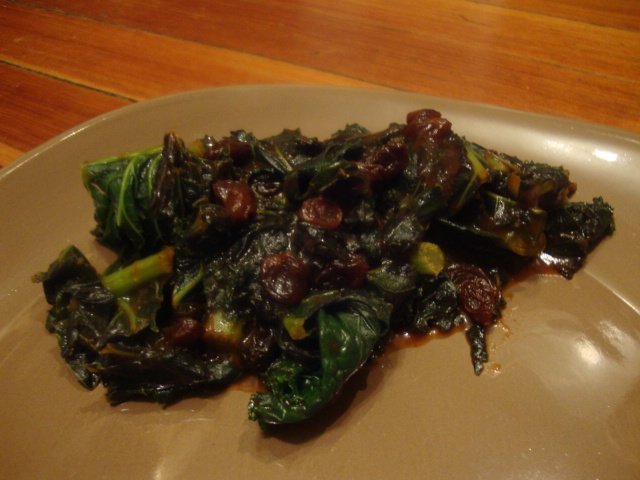 On side, steamed kale with Stubbs BBQ Sauce and raisins.