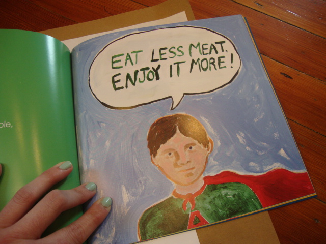 When I opened the package to squirrel cold cuts into the freezer, I discovered they also sent a cute book, children’s illustrations alongside their food philosophy. I think this page sums up my response to the vegan challenge pretty well –
