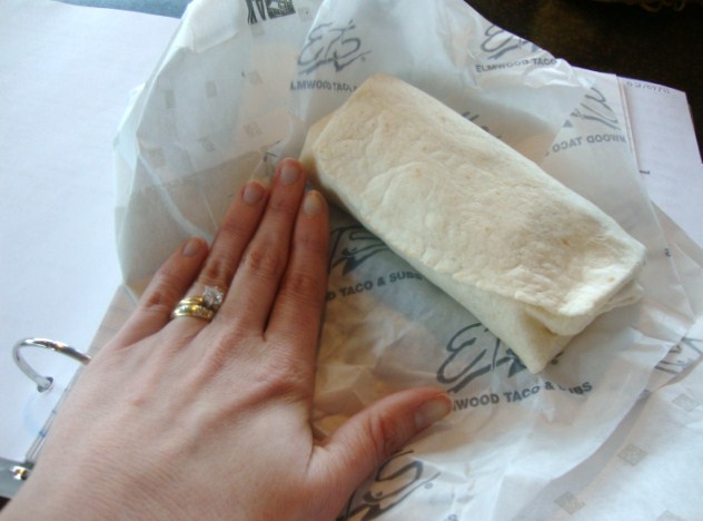 Walking back from campus in the hail (ouch!) wasn’t fun either, but I made it to Elmwood and got a nice set of work done. I nibbled while I worked, first a black bean burrito from Elmwood Taco and Sub.