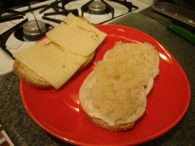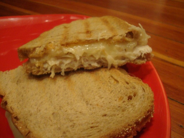 On two thin slices of rye went Applegate Farms Organic Chicken, two slices of 2% swiss, a handful of sauerkraut, and a serving of 1000 island dressing. Then we sandwiched and pressed in the George Foreman Grill.
