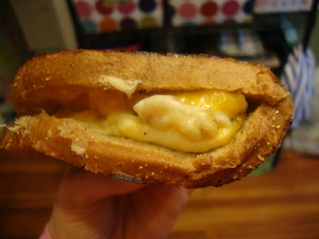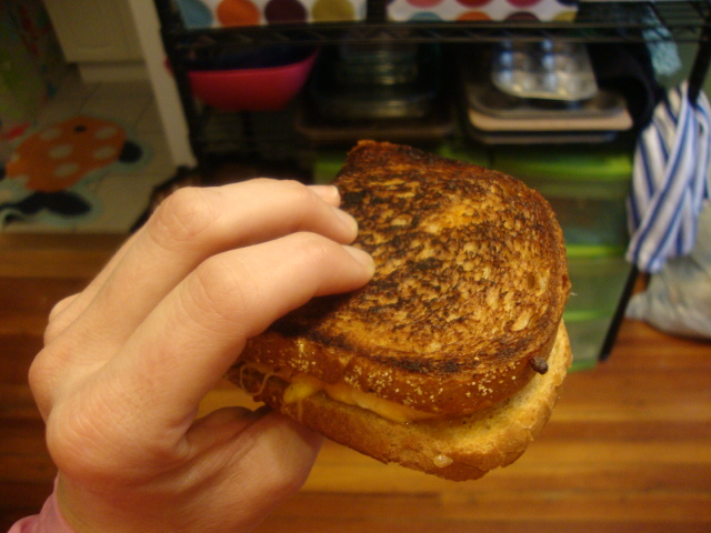 I made an epic grilled cheese sandwich. Rye bread with Thousand Island dressing, 1 oz of extra sharp cheddar, and 1 oz of 2% shredded mozzarella. I started out with two pieces of bread, but when I burned the daylights out of one side I ended up scraping off the cheese and folding the other piece in half.