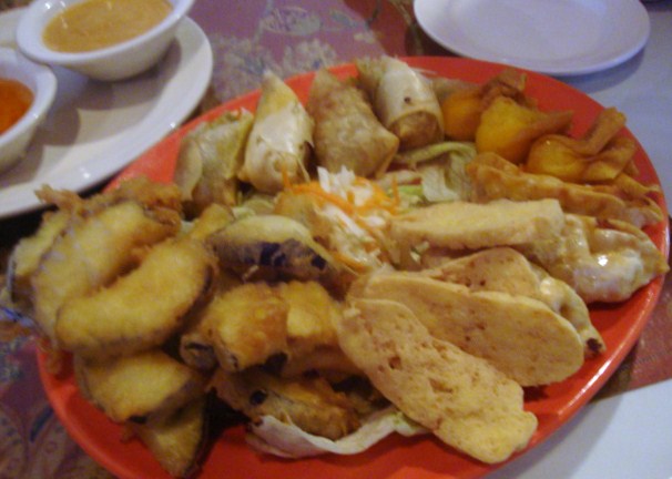 Veggie egg rolls, tofu tod, tempura eggplant, and crab rangoon.  Yes, this dinner was rather fried.