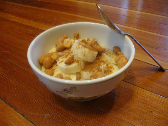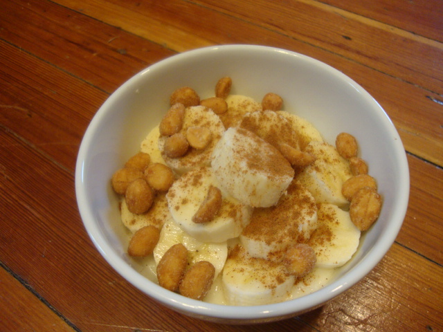 A sliced banana, a sprinkle of cinnamon, and some honey roasted peanuts.
