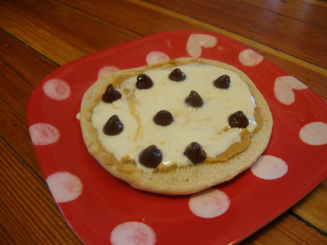 But it still didn’t quite squelch my hunger.  Enter 1/2 an Arnold’s Sandwich Thin, topped with pb, marshmallow topping, and chocolate chips for dessert.
