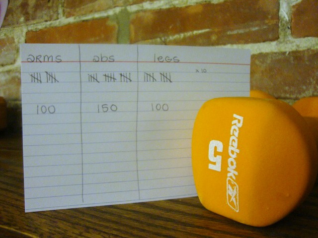 I’ve always got the time/energy for at least 10minutes total a day!  Here’s what I accomplished throughout this afternoon (reps) –