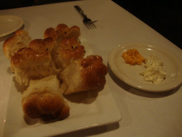 We started with complimentary bread with flavored butters (tomato, garlic, and honey).
