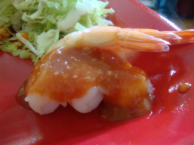 three shrimp with cocktail sauce,