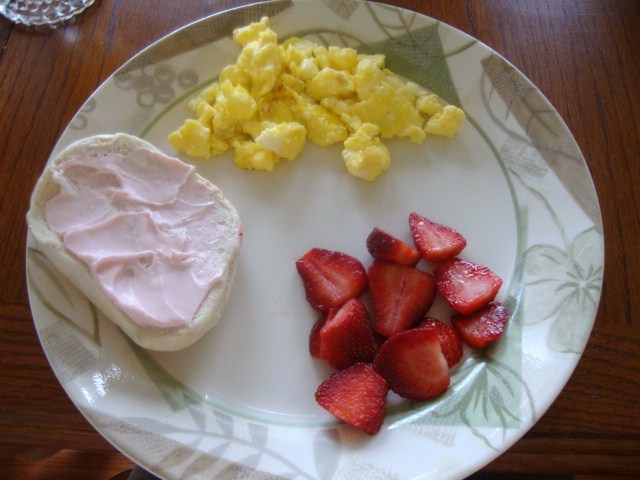 Scrambled eggs, strawberries, and half a bagel with strawberry cream cheese.