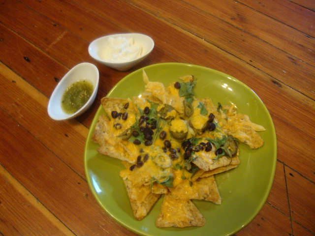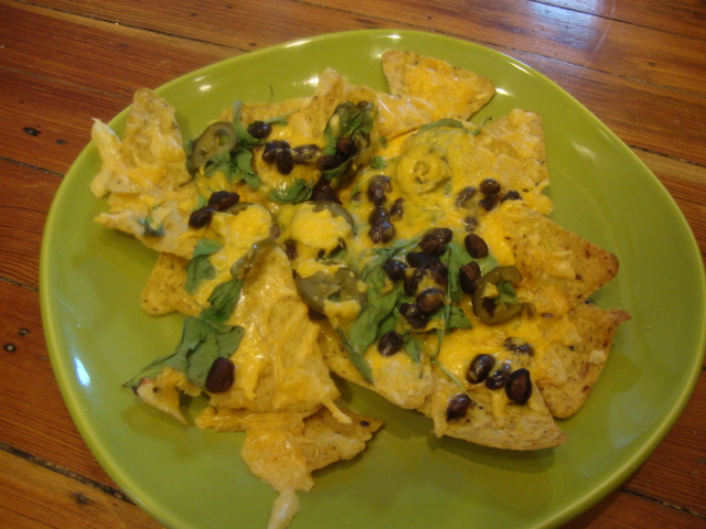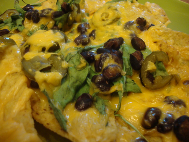 I piled corn chips with 50% reduced sharp cheddar, fresh arugula, black beans, and canned jalapeno, then baked at 450* for 10minutes.