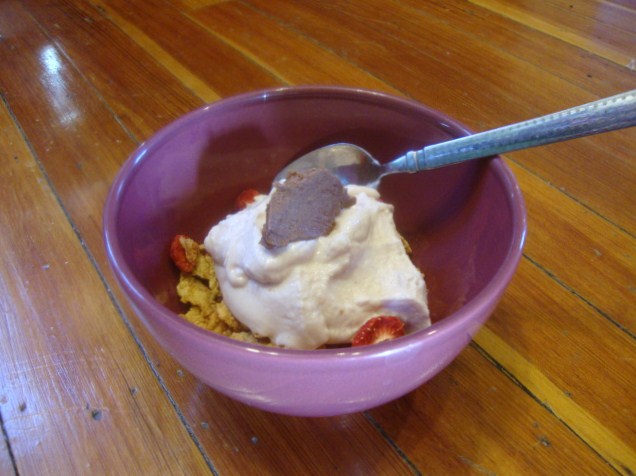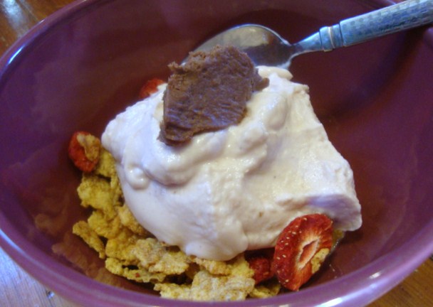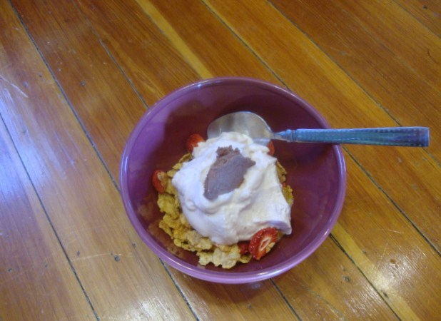 I topped a serving of Special K Red Berries with a splash of milk, a 0% strawberry Siggi, and a dollop of leftover top-secret chocolate frosting.
