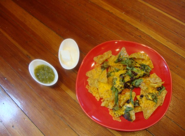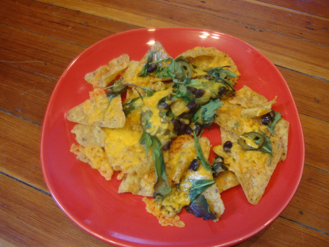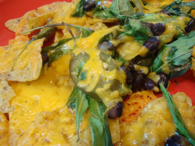 2 oz of corn chips + 2 oz of extra sharp cheddar + a big handful of arugula + black beans + jalopenos