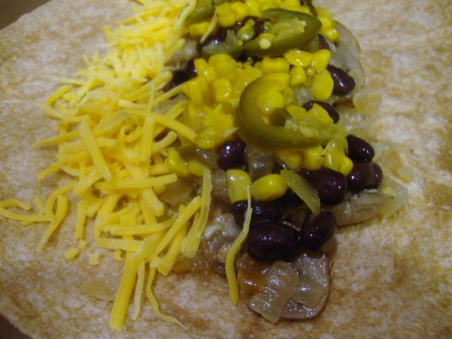 We topped whole wheat tortillas with sautéed mushrooms and onions, black beans, corn relish, sliced jalopenos, and some shredded 2% sharp cheddar.
