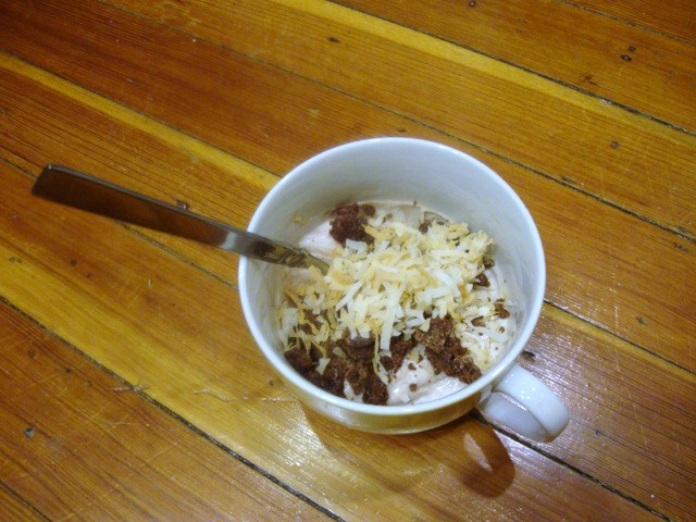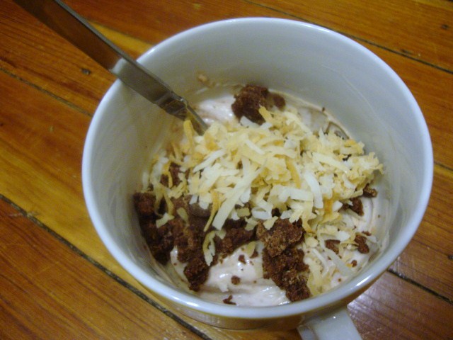 I stirred hot cocoa mix into some 0% Plain Oikos, then topped with brownie crumbles and toasted coconut.  I haven’t tasted it yet, but I can pretty well guess that it’s going to be amazing.