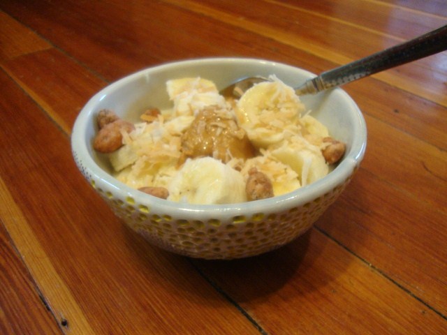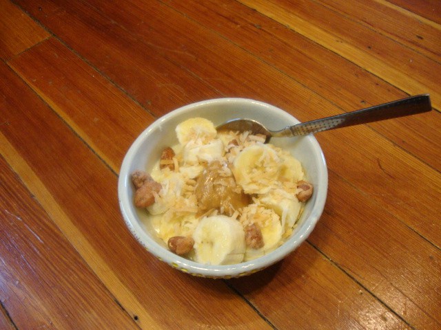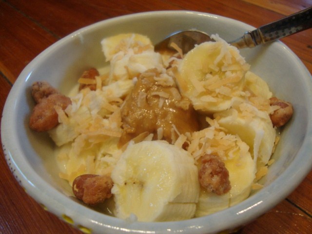 Greek style, fat-free honey and almond yogurt from Target.  A chopped banana.  1Tbsp of Smuckers Natural PB with Honey.  A few butter toffee almonds.  A sprinkle of toasted coconut.