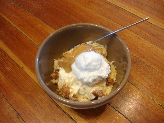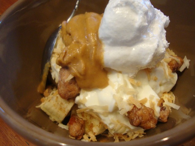 Chopped banana, a sprinkle of cinnamon, Yoplait 0% Plain Greek Yogurt, butter toffee almonds, toasted coconut, a dollop of marshmellow filling, and 1 Tbsp Smuckers Natural PB with Honey.