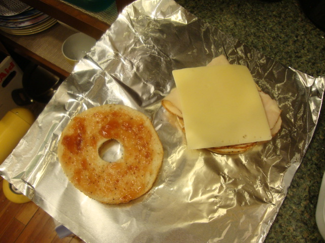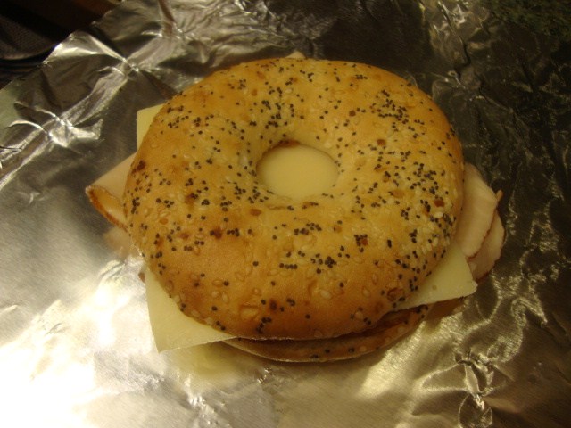 A slice of 2% Swiss, two slices of turkey, and Crofter’s Strawberry Fruit Spread on an Everything Bagel Thin.