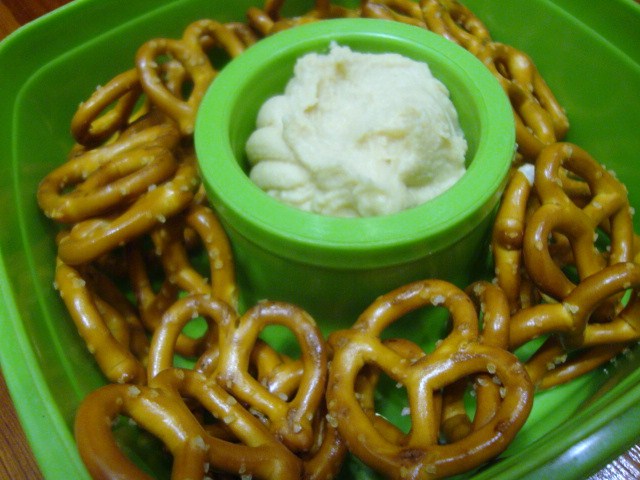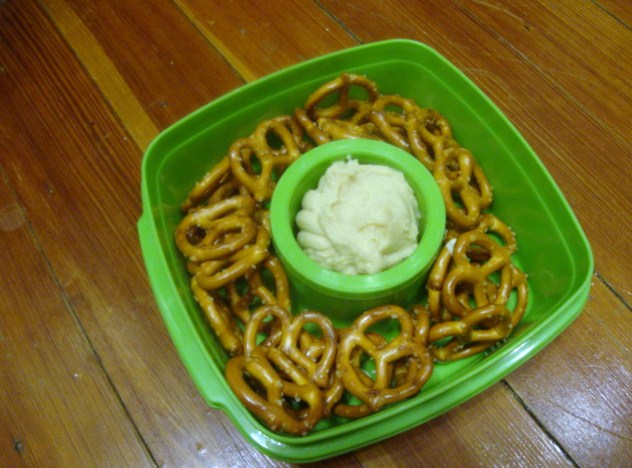 1.5 servings of Tribe’s roasted garlic hummus with 1.5 servings of pretzels.