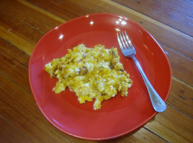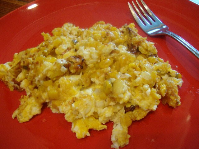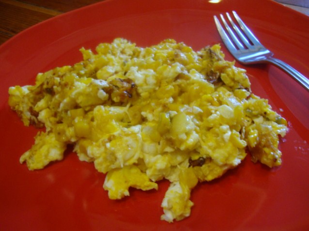 I sautéed some spicy corn salsa in a little butter, and then scrambled in 2 eggs with a handful of 2% extra sharp cheddar.