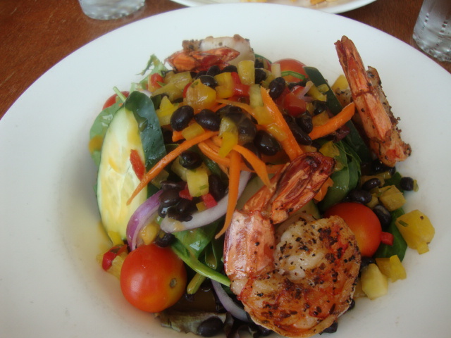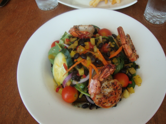 the Caribbean Shrimp and Mango Salad with mixed greens, mango viniagrette marinated jumbo shrimp, black bean and pineapple salsa and a mango viniagrette,