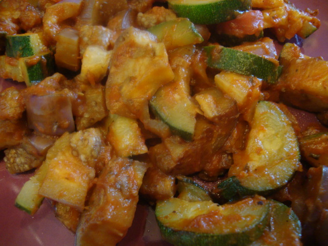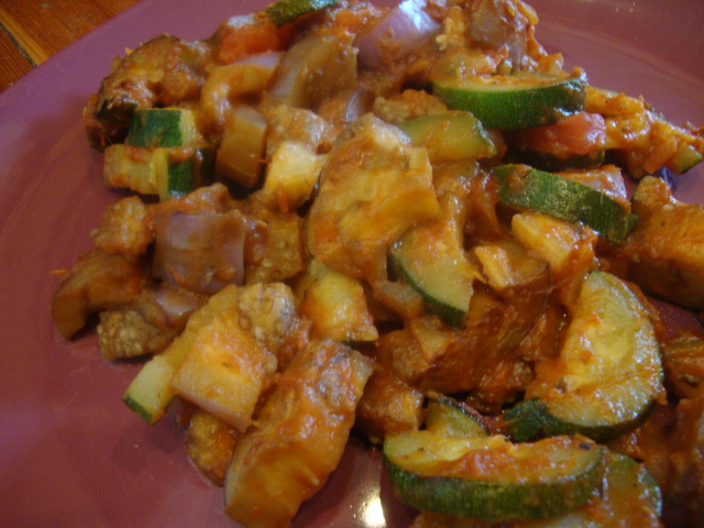 I sautee-steamed 1 neon eggplant and 1 zucchini, then tossed with a few glugs of Worchestershire sauce and the last of the Newman’s Own Roasted Garlic Marinara Sauce.