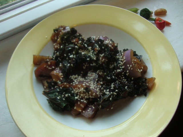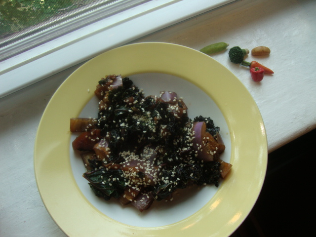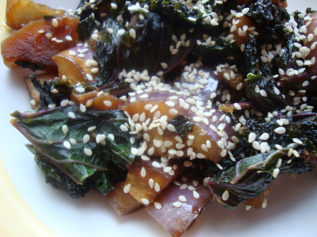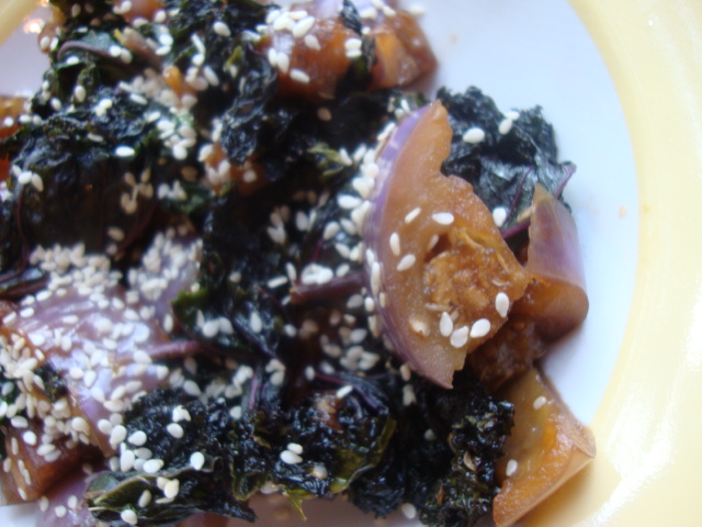 First I saute/steamed the eggplant and kale in a bit of sesame oil and water. Next I tossed the veggies with a mix of tamari, rice vinegar, and honey. Finally I topped them with some crunchy sesame seeds.