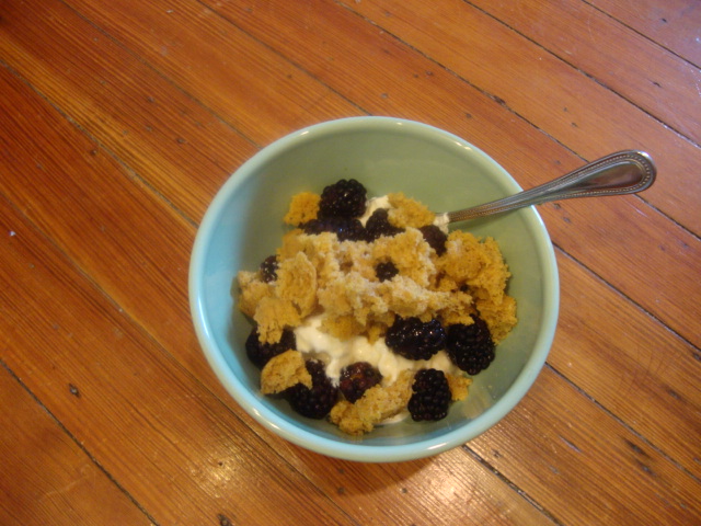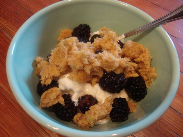 0% Plain Fage topped with 1/2 Tbsp maple syrup, a crumbled pumpkin muffin, and a big handful of blackberries.