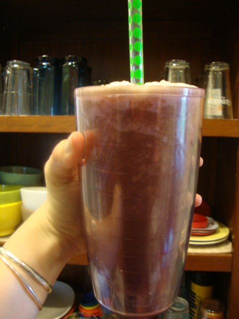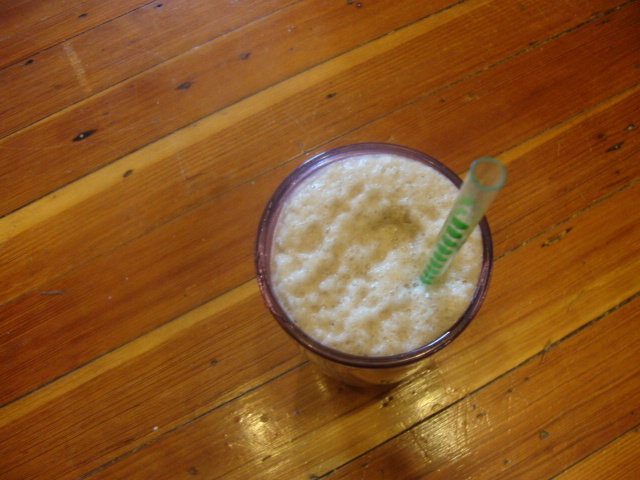 Homemade frozen coffee is so much better than anything you can buy at a coffee shop!  For 2 I blended 2 cups of coffee, 1/2 cup Silk Light Vanilla Soy Milk, 7 ice cubes, and 3 Tbsp of sugar.