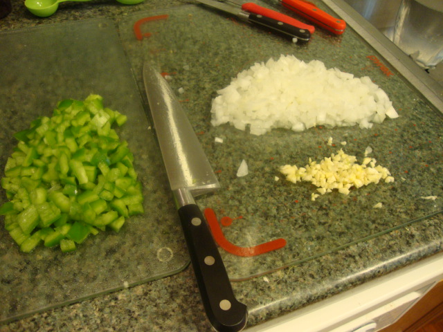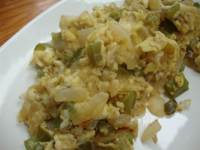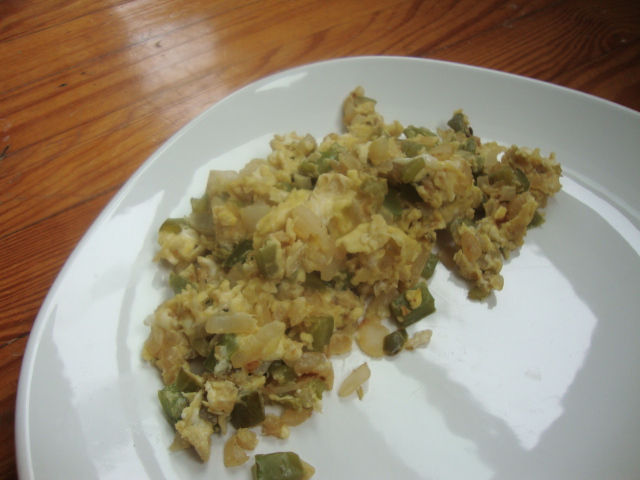 Sadly food was a low point.  We had an onion, some garlic, and a green bell pepper to use up so I decided to make eggs.