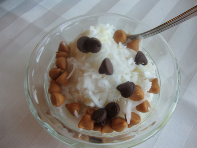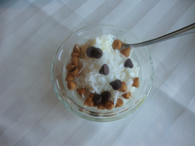 A small bowl of 0% Plain Fage with honey, shredded coconut, and a few Nestle morsels.