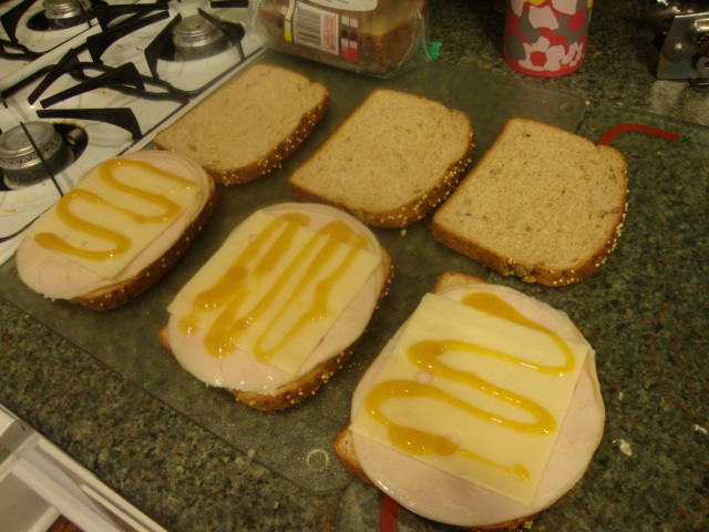 I assembled Nature’s Pride bread, Applegate Farms Organic Roasted Turkey slices, 2% Swiss cheese, and honey mustard; wrapped in tin foil for easy road munching.