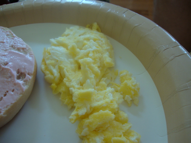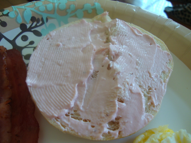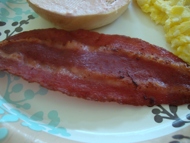 Breakfast called for carbs, protein, and bacon.  Half a bagel with strawberry cream cheese,