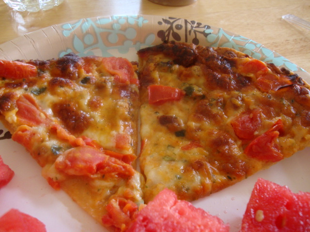 This veggie pizza was something my MIL found in the freezer section and it was so dang good; she was worried that the crust started to burn but it was crispy and crunchy in the best possible way.