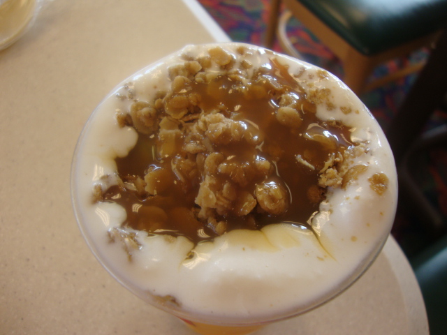 The melon was supposed to be dessert but my MIL and I found ourselves stuck at Wendy’s while the moving truck was returned and Frostys were calling our names.  The new Caramel Apple Parfait looked too good not to try.