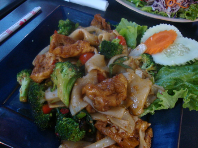 I ordered the Vegetarian Drunken Noodles with extra veggies, made Thai spicy. They delivered times two: tons of veggies to make my body healthy and tons of spice to make my soul healthy.