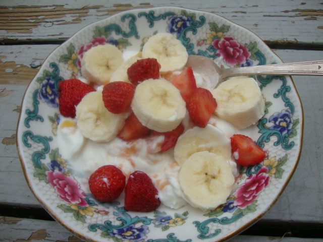 A 2% Mango Chobani yogurt topped with banana and strawberries,
